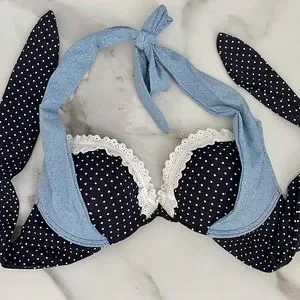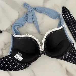 Sexy Black white polka bikini by beach bunny. The top is L, bottom is S, but skimpy so I consider it XS. Worn once. The top is like a dream push up bra that holds up the girls without digging in the neck. In excellence condition, just like self tanner Mark’s on inside straps, not noticeable when on. See pics