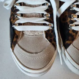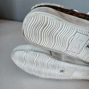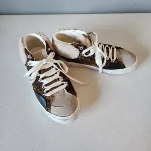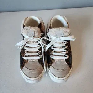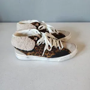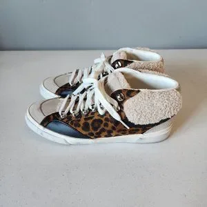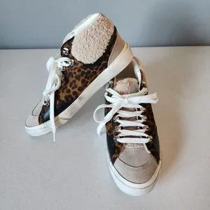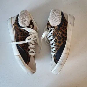 "NEW" Fantastic Looking Mid-top Sneaker By Marc Fisher. Lace Up Style, Removable Cushioned Insole, Leather Uppers with Faux Fur Trim, Distressed Rubber Soles, Leopard Print & Suede Accents, Golden Goose Look, New, Never Worn, Only Tried On:) Rt.160.00 approx. Size 7, Foot Bed Measures 9.5" for Reference.
