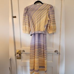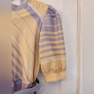 Diagonal and horizontal striped design. Puffed sleeves and button details on the shoulder. Matching belt.