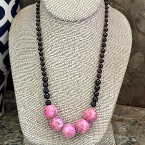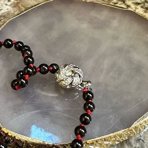Beaded necklace with a silver swirl rhinestone hook and eye clasp . The beads are natural Rhodonite with simulated garnet beads . The length is 18 inches and beads range sizes are from 4mm to 14mm .