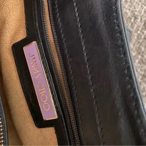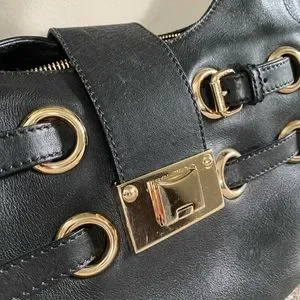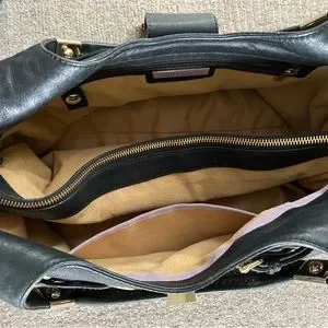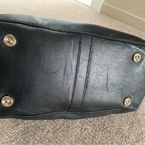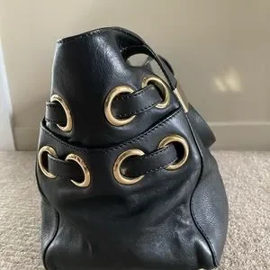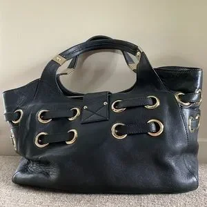 Black top grain leather with suede interior and gold hardware; excellent condition; bag measures 14” wide x 9” high (16” with handles) x 7 “ deep