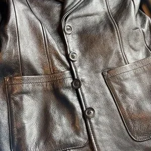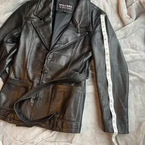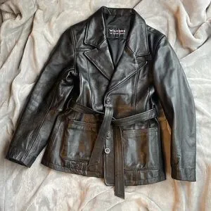 90s/Y2K thick leather jacket. 4 button closure. Tie waist for added style. Front pockets. Great condition. Measurements are included in pictures.