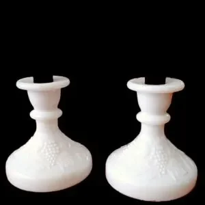 A lovely, hard to find, matching pair of vintage Westmoreland candlestick holders in the Grape and Leaves design.