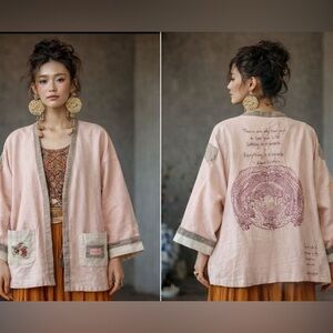It’s a handmade(every single stitch)reversible jacket. Embellished with embroidery, Swarovski crystals , hand painting and including the most famous Albert Einstein quotes. 100% cotton.