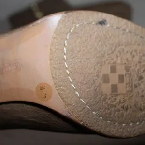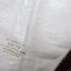 In overall very good condition, with 1 small defect. Looks like maybe a scratch. See last photo. Darn tan leather uppers and leather lining. There is a 5 inch inside side gold tone zipper. 3 1/2" stack heels and textured rubber soles. Size 9M