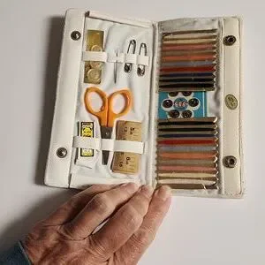 Vintage sewing kit with vinyl checkbook style cover with snaps; Includes many different color threads, vintage snaps, needles, buttons, small scissors, tape measure, needles. Small tape measure is paper and quite brittle so I did not open it up. Vintage snaps say Model 999.
