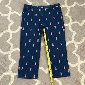 Dark wash Capri jeans with one back pocket. Pink pineapples with green leaves adorn these cute lightweight jeans. Great for the golf course too! See measurements in photos.