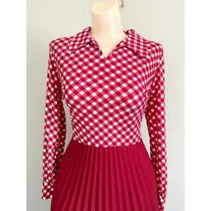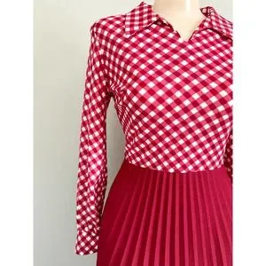 Vintage 60s 70s Red Check Skater Accordion Pleated Dagger Collar Mod Red Dress