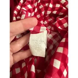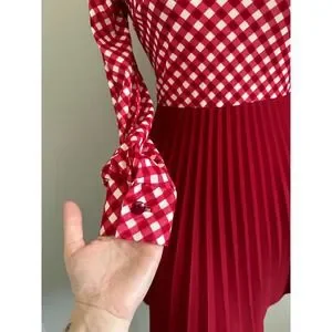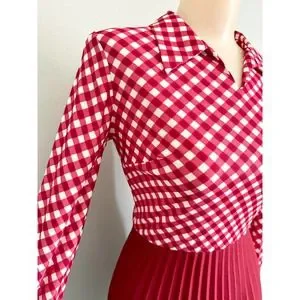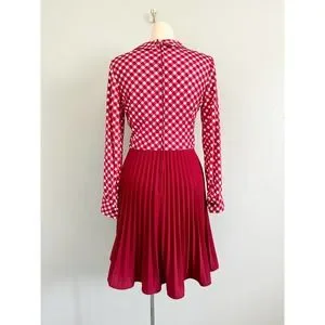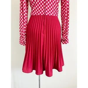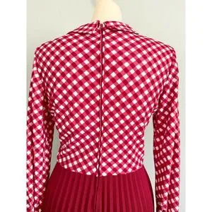 This beauty features a red diagonal red & white check bodice with a solid red accordion pleated skirt. It has a v neck line with a dagger collar. Zips down the back. Long sleeves with a button at the cuff. Mod, office, secretary, stewardess, brady bunch, skater, mad men, checkerboard