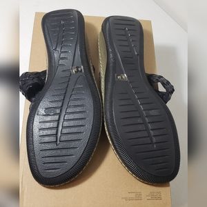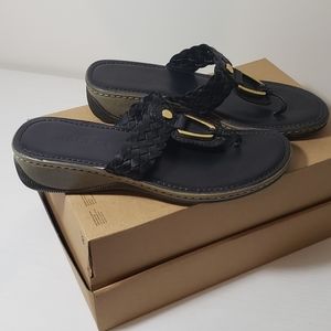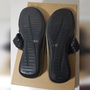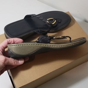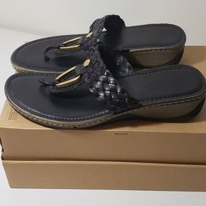 This is a gently used pair of leather Kolya thong sandals in women's size 8 by Sesto Meucci. Black leather with gold accents, slight wedge heel, and good sole traction evident. Purchase size stickers present on the bottom soles.