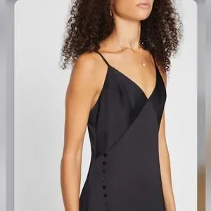This sleek slip dress stuns on its own but looks perfectly polished under other layering pieces in your wardrobe. Distinguished by details like the adjustable tie-back straps and a pretty row of side buttons.