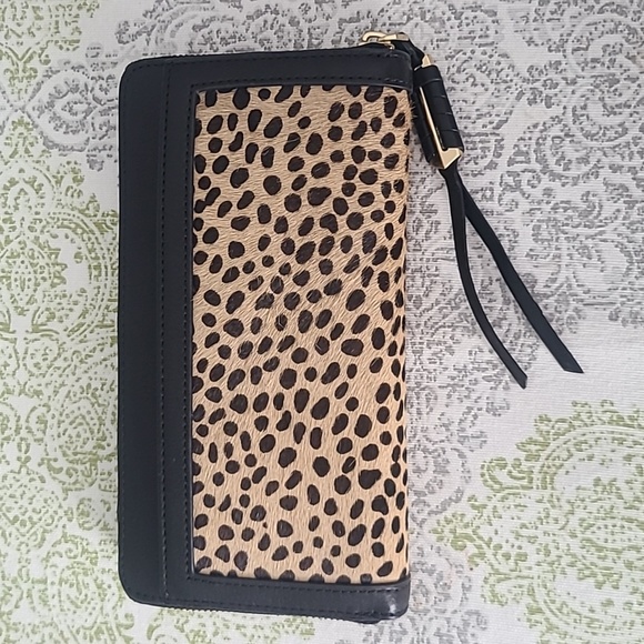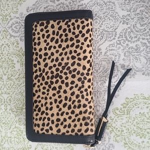 Covet by Stella & Dot Mercer Leopard Wallet, new in box, smoke-free home. Calf skin leopard and leather. 8"x4", gold details, credit card slots and zippered coin pocket.