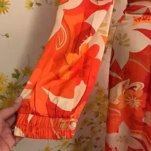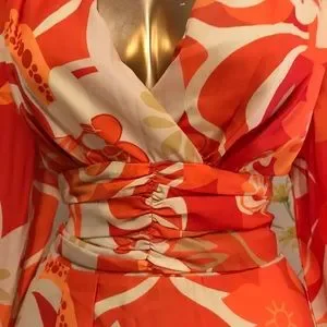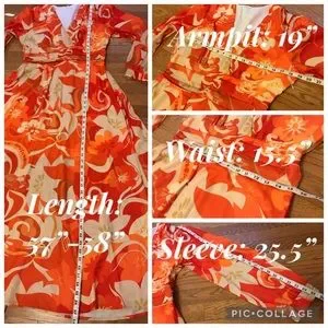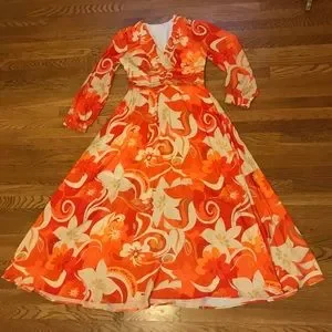 Beautiful maxi dress featuring a flowy maxi skirt, orange colors, long sleeve with elastic cuff, mini dress lined, Surplice V neck, wide pleat at the waist for a flattering figure. STOCK PHOTO ONLY FOR STYLE PURPOSE, the dress on mannequin is clipped on back. smoke pets free home, fast shipping. Color may vary by device screen and light. All measurements are taken by hand, there may be a variation, size is M, I would say may fit in size L as well, see measurements for a better fit