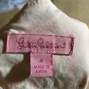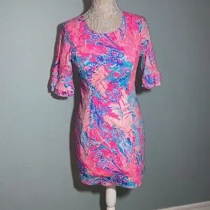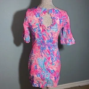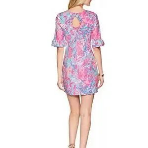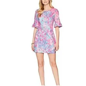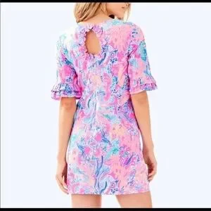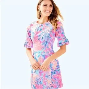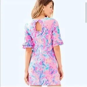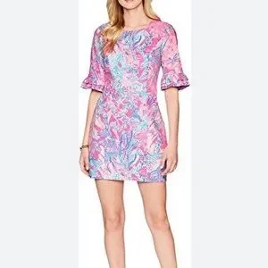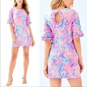 Lilly Pulitzer fiesta stretch dress light pascha pink aquadesiac shift dress double ruffle half sleeve fully lined concealed zipper keyhole back lined. Gently used washed and flat to dry Sz 4 34” length 16.5” pit to pit 15” waist 18.5” hips measured flat