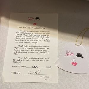 This doll is a beauty. She has a nice red dress for the holiday. All paperwork is included.