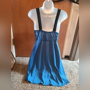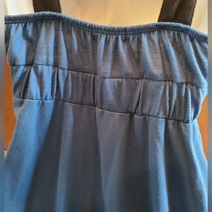 This is a super cute navy blue with black wide straps halter type sun dress. This is a soft cotton blend that is stretchy and lightweight. This is a high wasted dress by Miss Chievous in great gently tested condition. The approximate unstretched measurements;