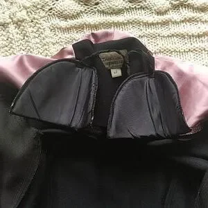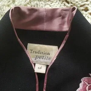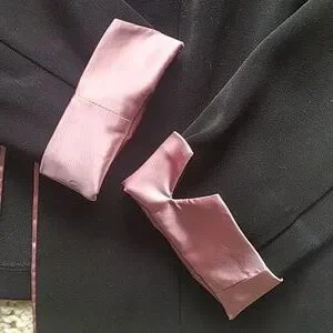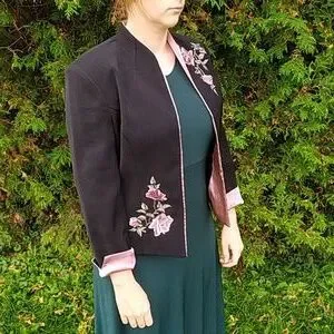 One of my favourite finds, this petitie jacket has lots of unique features: Pink roses embroidered on the front; mandarin collar; turn back cuffs; pink piping around the front; cuffs, lapels and collar lined in pink satin; princess seams for a sleek fit; darts for neck shaping; shoulder pads.