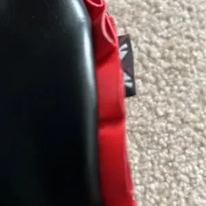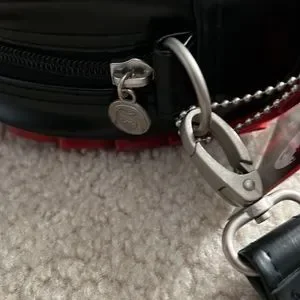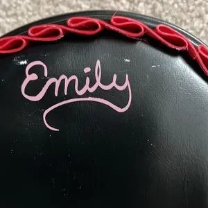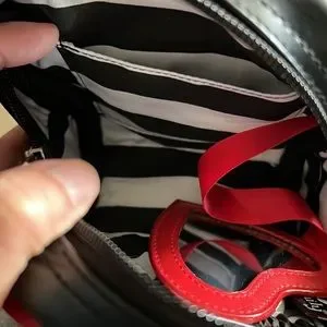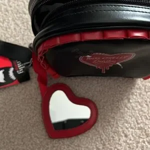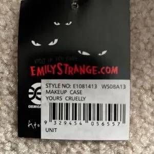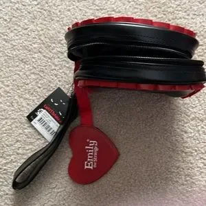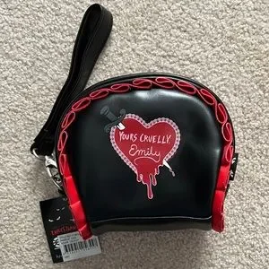 Zipper closure with removable wrist strap. Attached heart shape mirror inside. ribbon around the outside border. Yours cruelly designs on one side/ Emily on other side. Never been used/ has been stored.