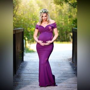 Size small purple off shoulder maternity gown with train. Purchased from Pink Blush in 2021. Only worn for a couple of hours for photos.