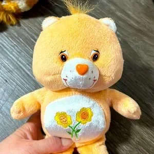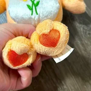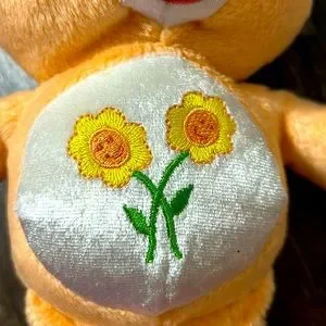 Friend bear care bear baby with embroidered sunflowers in chest and heart in feet. Peach orange fur color