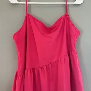 Adjustable spaghetti strap, zipper on the side, asymmetrical line patterns, double lined. Stretchy material