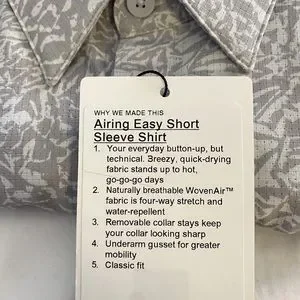 Introducing the Lululemon Airing Easy SS Short Sleeve Shirt for Men, designed for utmost comfort and style. This versatile shirt features a collared neckline with button closure and a relaxed fit, making it suitable for any occasion, be it casual or workwear. The shirt is made from a high-quality woven polyester blend material that is breathable and perfect for all seasons.