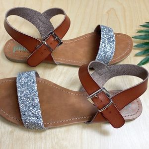Gently used- Plume silver glitter/sequin and brown sandals. Adjustable buckle for ankle straps. Minor wear on bottoms.