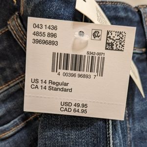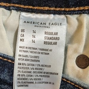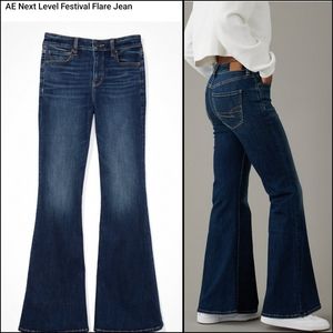 New with tags. American Eagle Festival Flare Ultra / Super Flare Jeans size 14. Dark wash, no destruction. High Rise. Next Level Stretch. Waist flat unstretched 16.5", rise is 11.5", inseam is 31", leg opening is 14" (28" total bell). Bundle discounts available, ships immediately from smoke-free home