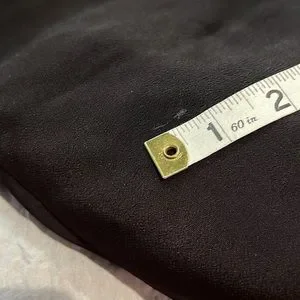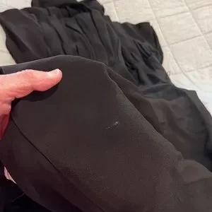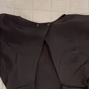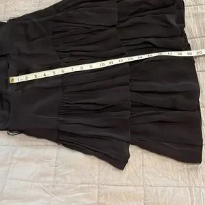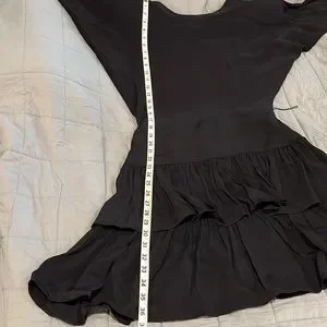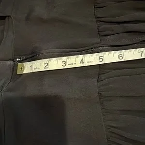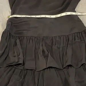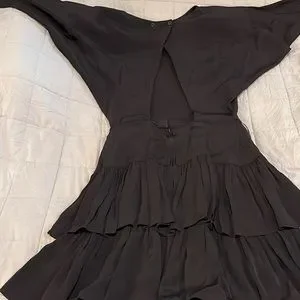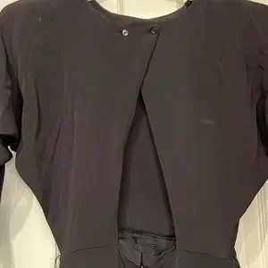 Betsy & Adam cute black cocktail dress. The crisscross back is a show stopper. Also has shoulder pads. Sleeves built in giving the butterfly appearance. 2 layers of Ruffles in the skirt. Size tag was cut out. I worn either 8-10. Please see photos for approximate measurements and details. If you have any reservations about the fit please do not buy since the tag was removed. Smoke and pet free home. Note photo showing something on left shoulder. I was not able to remove it. Perhaps a dry cleaner could. Priced accordingly due to the spot.