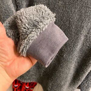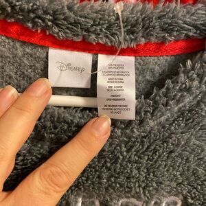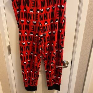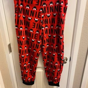Up for auction is a NWOT pajama set from Disney. It is a size XL (juniors?) with fluffy gray top and fleece pants. The top is 100% polyester with Minnie on the front. The material is wooly faux fur. Top measures 21 inches across the front of the chest, armpit to armpit, and 25.5 inches from the top of the shoulder to the bottom of the shirt. It does have to give to the material. The second item is a pair of red and black fleece pants with cuff. 100% polyester with elastic waistband. 36” waist X 28.5” inseam. Not sure if these originally went together, but they match nicely and neither has been worn. CUTE!