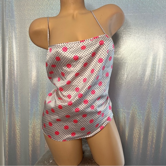 Victoria secret 2 piece silky satiny set tank and shorts polkadot neon pink y2k. Top large. Shorts medium. Only selling together. Stunning new without tags set. Champagne Color with black and neon pink polkadot. Open key hole back. Super cute set and rare!