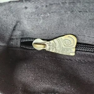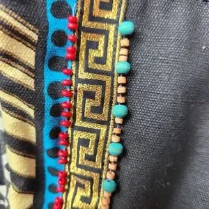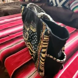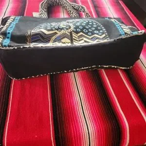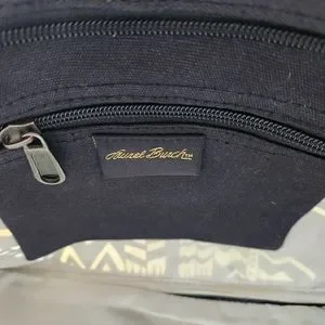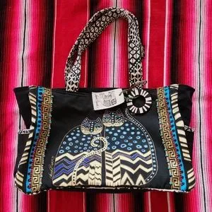 Colorful Laurel Burch canvas tote with double straps and zip closure. Bag is in pristine condition as it has its detachable tags still tied to straps. It's her usual cheerful cats x 2. One side has wooden beads and gold Greek key trim for embellishments. Straps are a black/white geometric print as is the piping around the bag. There are two outer pockets on the outside and one zippered pocket inside bag. It zips closed with brass cat shaped hardware. Excellent condition; this bag looks like it's been stored and never used. No odors or issues to note.