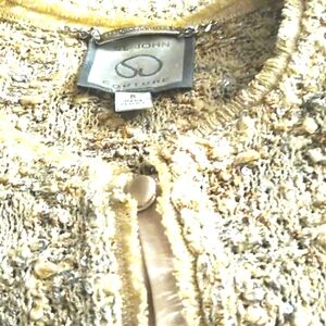 EXQUISITELY STUNNING! CROCHET,LACE, KNIT, BOUCLE EMBEDDED /W AURORA BOREALIS IRREDESCENT SEQUINS THAT LOOKS LIKE SWAROVSKI CRYSTALS OVER METALLIC THREADING THROUGHOUT, CREAM LIGHT BEIGE (LOOK CLOSELY PICTURES DON'T CAPTURE TRUE BEAUTY), SILK TRIMMED /W SILK COVERED BUTTONS & RAW EDGES JACKET BY ST JOHN COUTURE, SIZE 8( ORIGINAL COST $1985. SKIRT IS A NOVELTY KNIT BOUCLE /W METALLIC THREADS
