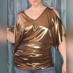 Get the party (or possibly a riot) started in the gold cold shoulder top by Venus. Worn once, this is completely unforgettable for any party or evening occasion.
