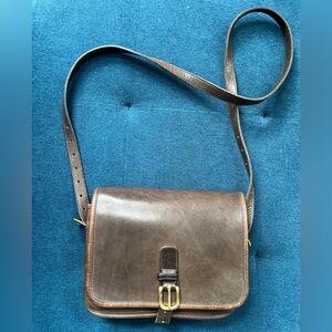 This vintage Coach Buckled Saddle Pouch was made in New York City in the 1970s. It is made of glove-tanned brown leather and brass hardware, and has a detachable and adjustable strap. It can be worn as a shoulder or crossbody bag. There is some minor wear and scratches consistent with the age of the bag, but no major damage. There are natural wrinkles and flaws in the leather that add interest to this unique beauty. This bag has an amazing patina, and has clearly been well-loved. The leather is thick and smooth.