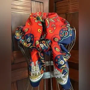 Say Bonjour La France with this vibrantly colored scarf from Paris. Each corner shows a different monument. Perfect for any lover of France. New, never worn. Large square 30x30