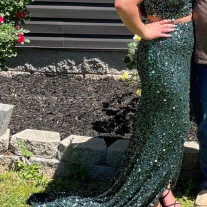 Beautiful 2 piece Dark Emerald Green Prom Dress by Sherrie Hill. Size 8. Worn one, paid $550 from boutique. The cute top laces up in the back. No alterations made.