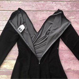 Exquisite vintage Tadashi long-sleeved black velvet gown with a rhinestone brooch at the side and satin strips fanning out from it. Two crystals are missing from the accent piece, but it isn’t terribly noticeable. V-neck, back zip, thick velvet, unlined. Truly beautiful formal dress, perfect for spooky season. Very witchy and magical. Other than the missing stones, it’s in perfect condition. Vintage size L, would best fit a modern M. Fabric has a lot of stretch. Please check measurements. For reference, I usually wear a 4 or 6 in dresses, am 5’ 7.5” tall, and I am small in the bust. This fits beautifully everywhere but is a little too large in the bust area.