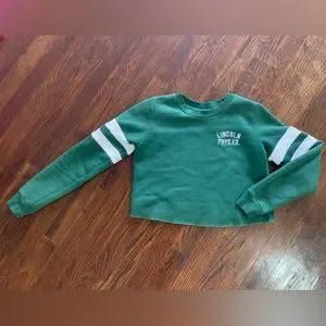 Super cute and cozy! Dark green cropped sweater with a raw hem and white stripes on the sleeves. Says Lincoln Phys. Ed. on the bust. Worn once or twice, no flaws. Size 0 petite. Message me with questions!