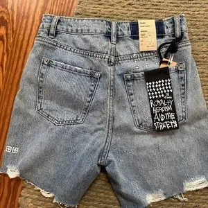 The Racer Shorts are made from a heavy stonewashed premium denim in a light to mid blue wash with subtle distressing. These shorts are longer and also feature a high waisted, fitted design, thigh grazing length, raw hem, classic five pocket styling and signature branding.