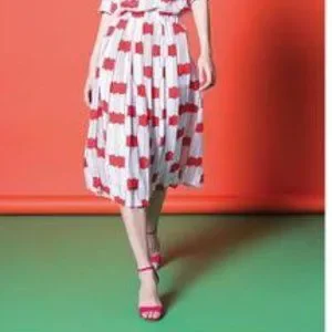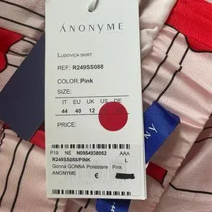 Anonyme Ludovica skirt, size 12 (EU 44). Made in Italy. Lightweight, fully lined polyester skirt, easy care. Soft pink, red, and black. Interesting abstract pattern. Hits below the knee. 15” waist, 30” waist to hem.