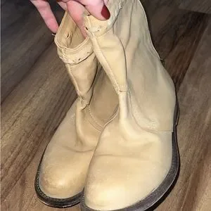 Have a Carmel/tan brown color with cute braiding detail lining the top of the boot. Only selling because I never wear these shoes!!