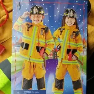 Adorable Firefighter Costume by Teetot in size 5-6 toddler little kid. Excellent quality! This costume features a yellow jacket and pants bottoms with reflective striping. It has a fire department themed patch on one arm, lettering on the back of the jacket that says "FIRE DEPT", an attached functioning red whistle, toy radio, thick quality adjustable helmet, and toy fire axe which stows in a loop on the side of the jacket. There are multiple cargo pockets on the jacket and pants, as well as a chest clip on the chest. The jacket secures with Velcro closures. The pants have an elastic waistline. Included accessories: Whistle, helmet, radio, fire axe. 84% cotton, 14% rayon.