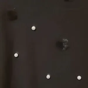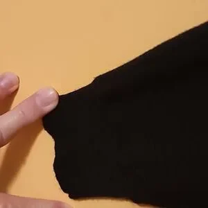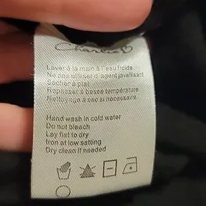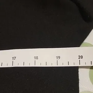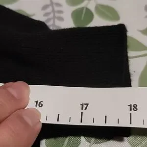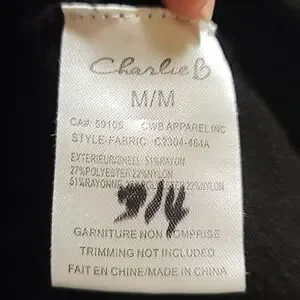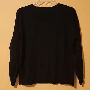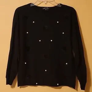 Beautiful soft black knit in rayon, polyester and nylon, with faux pearls and faux fur buttons on front. Crew neck. Long sleeves, and hem with ribbing. Hand wash or dry clean.