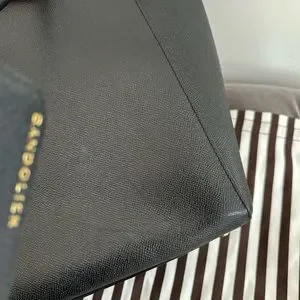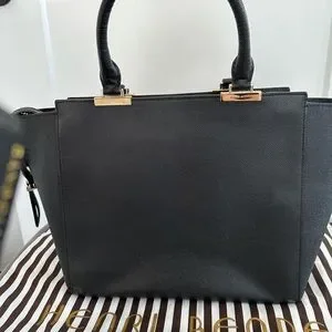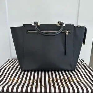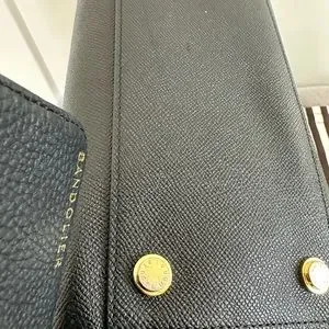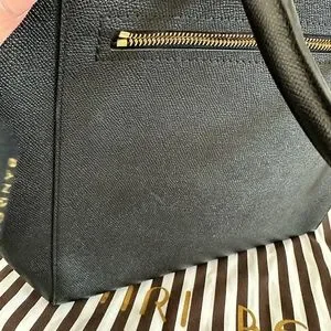 Black pebbled leather tote bag, comes with dust bag. Very good condition, used on one business trip. Some very light almost not noticeable scratches - pictured, and one more noticeable mark on the bottom corner, also pictured. Comes with top handles only. Black pebbled leather, gold tone hardware, zip front pocket, interior pockets and zip closed top.
