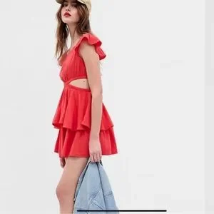 ❤️ Gap ! Tiered Ruffle Hem Mini Dress ! Side Cut Outs ! Soft Cotton Blend ! Machine washable ! Short Ruffle Sleeves ! Boatneck ! Fit & Flare Silhouette ! Color ❤️ Hawaiian Red ! 5 Stars on Gap Site ! Beautiful ! ❤️