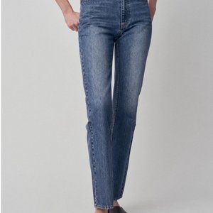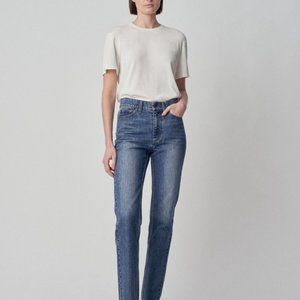 Great jean for everyday wear. High-rise fit, straight leg organic cotton denim jeans. Fading and whiskering throughout.