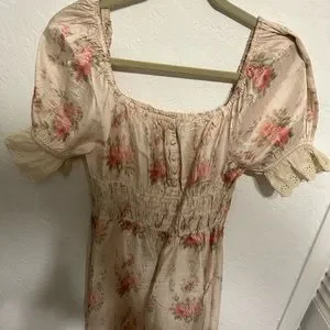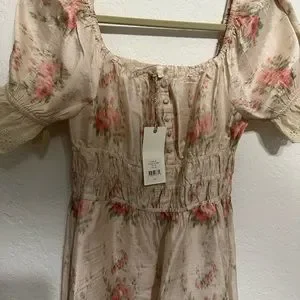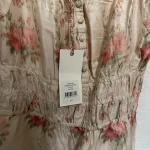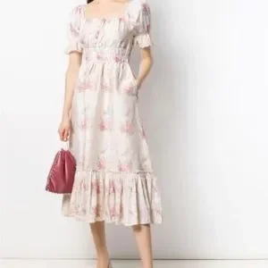 Cream white silk floral print Terrence dress from Love Shack Fancy featuring a square neck, short puff sleeves, embroidered details, a front button fastening, an elasticated waistband, a floral print, a mid-length and a ruffled hem. Purchased a few years back for family pictures and ended wearing something else.