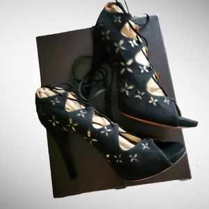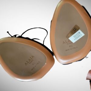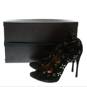 ALAIA |New in Box Black Suede w/Metallic Gold Floral Trim Open Toe Pumps S…