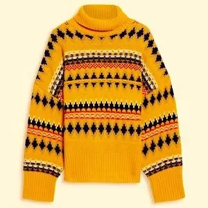 Bright colors modernize this classic Fair Isle knit turtleneck, knit in a cozy, cocoon shape.